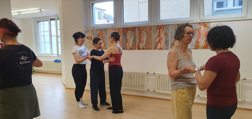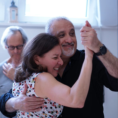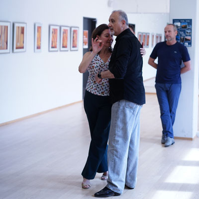 Im nächsten Schritt übertragen wir das Gesehene in die Praxis: Wir probieren kurze Sequenzen aus, experimentieren mit Haltung, Umarmung, Schrittqualität und musikalischer Interpretation – und spüren, wie sich jede dieser Ausdrucksformen körperlich anfühlt.